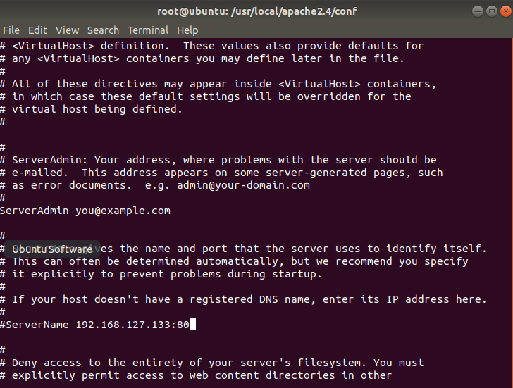 ServerName 을 리눅스서버의 아이피인 192.168.127.133:80 으로 바꿔주었다.