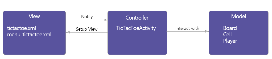 이 내용을 코드로 작성하면 아래와 같다. Android 에서 MVC 는 class 하나로 모든 처리가 가능한 구조가 만들어진다.