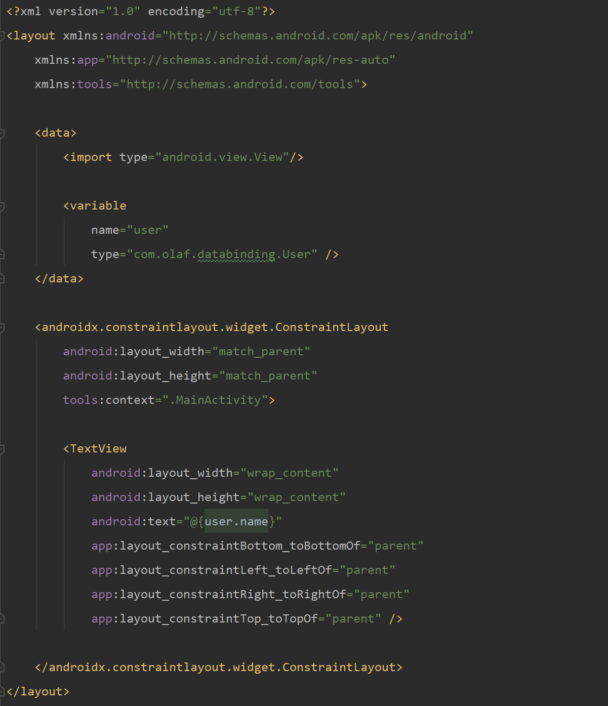 5. xml 리소스의 <layout> 태그 안에 <data> 요소를 작성해준다.