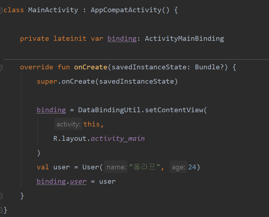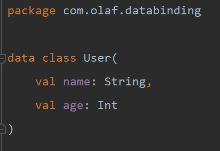 data 객체를 view 와 bind 하기 위해서, User 라는 이름의 data class 를 하나 만들어줬다.