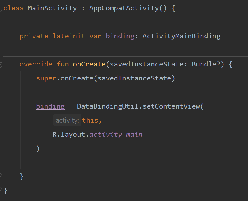 3. Activity 에서 기존의 setContentView() 함수를 DataBindingUtil.setContentView() 로 교체한다.