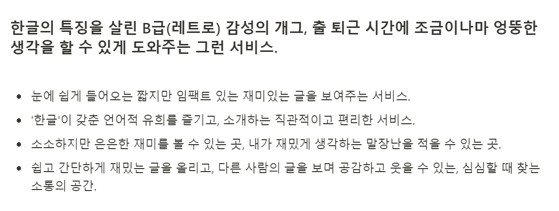 사실 나는 구체적인 자료조사나 시장조사를 해보고 아재개그 프로젝트 아이디어를 발제한 것이 아니었다. 단순히 내가 사용하고 싶은, 그리고 동아리에서 가볍게 즐기면서 두 달 안에 완성해서 런칭까지 할 수 있는 사이즈의 프로젝트 아이디어 정도로 생각해서 발제한 아이디어였다. 그래서 이 서비스의 기획을 제대로 완성하고, 서비스에서 제공해야하는 기능을 완벽하게 정의할 필요가 있었다.