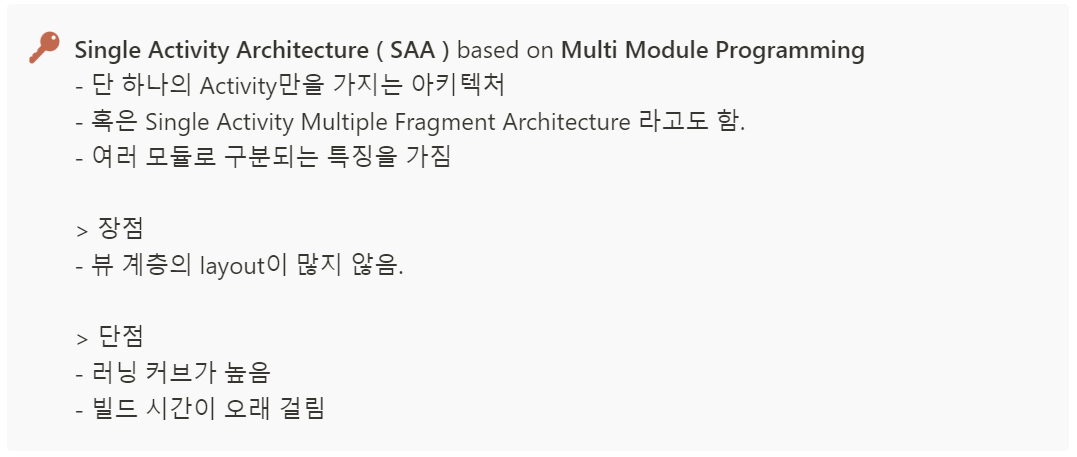 그런데 droidconKE 앱에서 SAA 라는 아키텍쳐를 사용하고 있었다. SAA(Single Activity Architecture)는 하나의 Activity 를 애플리케이션의 단일 진입점으로 사용하고 UI 는 Fragment 를 통해 보여줌으로써, 안드로이드 프레임워크와 분리될 수 있는 코드들을 Activity 에서 최대한 분리하는 아키텍쳐라고 할 수 있다. 우리는 요즘 구글에서 밀고있는 SAA 또한 우리 프로젝트에 적용시키기로 결정했다.