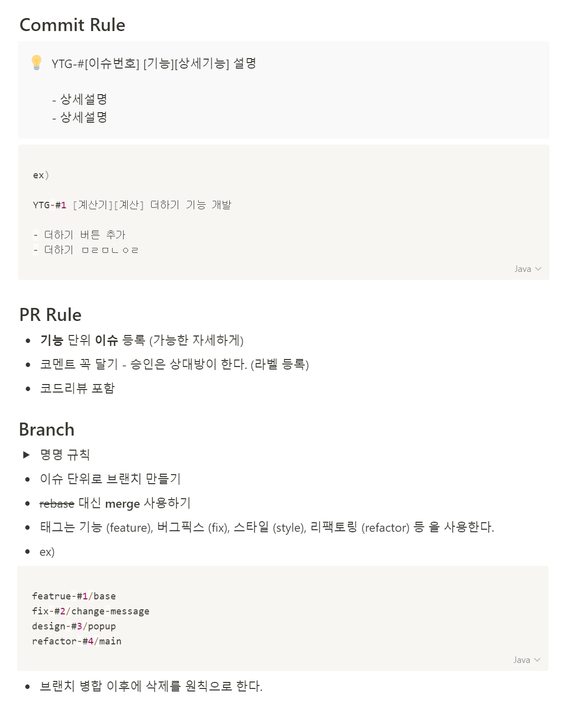 먼저, 협업의 가장 기본이라 할 수 있는 Git Commit & PR & Branch Rule 을 정의했다.