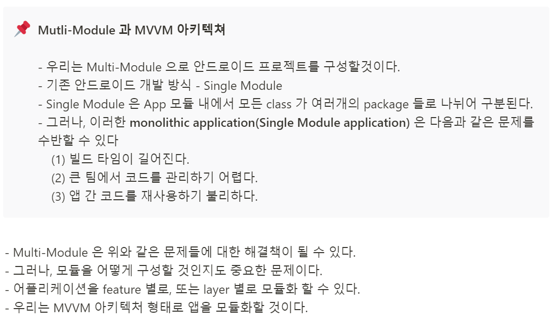 또한, 아키텍쳐에 대해 논의했는데, 거의 내 멘토라고 부를 수 있는 다른 안드로이드 개발자분께서 우리 프로젝트에 Multi-Module 을 도입해보자고 하셨다. 그래서 안드로이드팀은 아재트 기획과 디자인이 완성되기 전에 2주동안 Multi-Module 로 간단한 샘플 프로젝트를 만들어보고, 초기 세팅을 해두기로 결정했다.