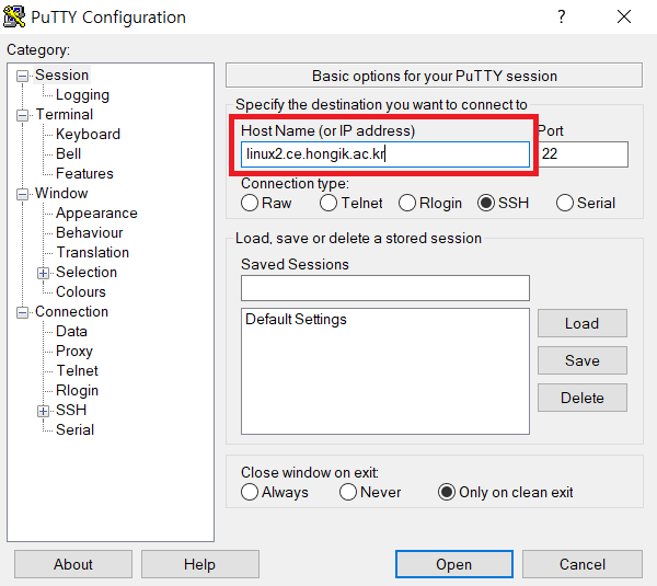 (2) Connection type 을 SSH 로 선택한다.