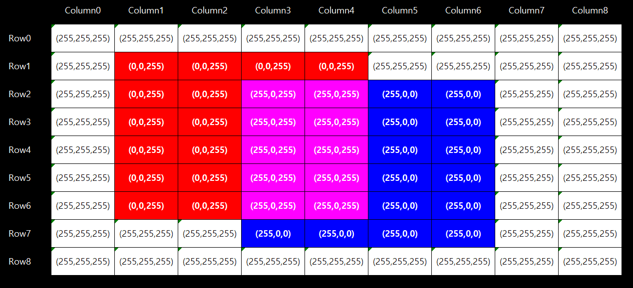 예를 들어 픽셀값이 (0,0,255) 인 경우 red 채널만 255이므로 해당 픽셀은 빨간색이 되며, 픽셀값이 (255,0,0)인 경우에는 blue 채널만 255이므로 해당 픽셀은 파란색이 됩니다