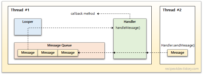 핸들러는 핸들러 객체를 만든 스레드와 해당 스레드의 message queue 에 바인딩된다. Message queue 는 핸들러가 전달하는 message 를 보관하는 FIFO(First In First Out) 방식의 큐이다. 다른 스레드에게 메시지를 전달하려면 메시지를 전달하려는 스레드에서 생성한 핸들러의 post() 와 sendMessage() 등의 함수를 사용해야한다. 그래야 수신대상 message queue 에 메시지가 저장되기 때문이다.